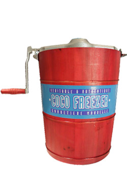 D’aspect, la sorbetière traditionnelle des îles se compose d’un seau en bois coiffé d’un mécanisme de brassage métallique à actionner par une manivelle.